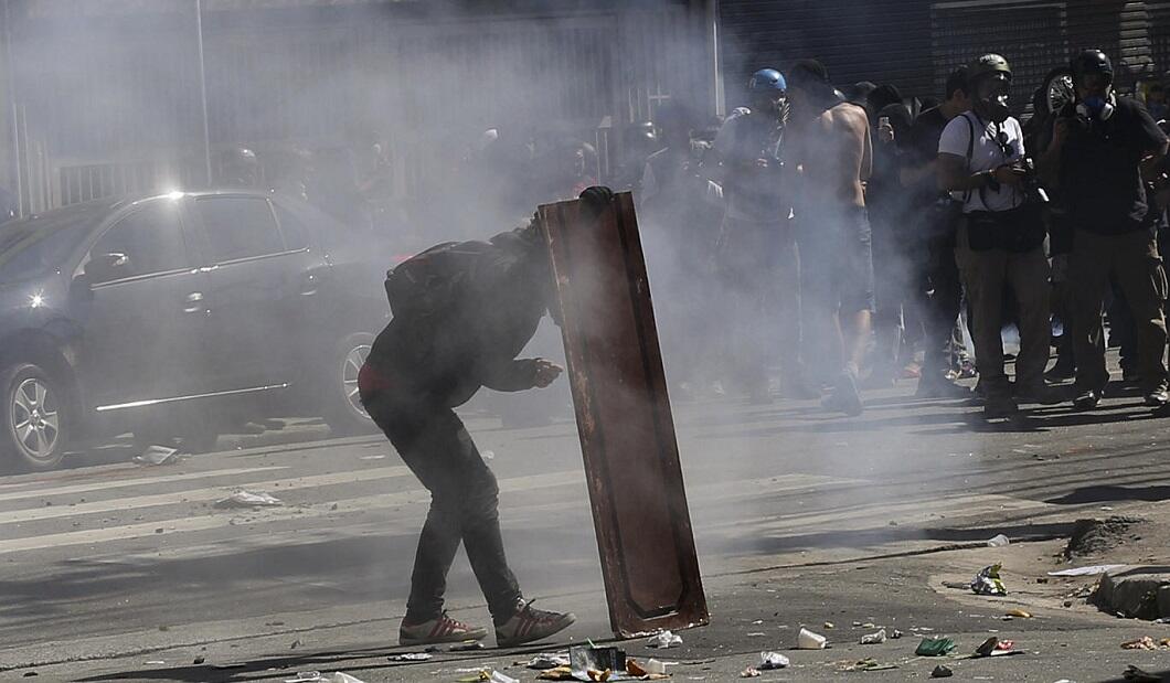 7. Демонстрант укрывается доской во время столкновений с полицией в Сан-Паулу, 12 июня 2014. (© REUTERS)