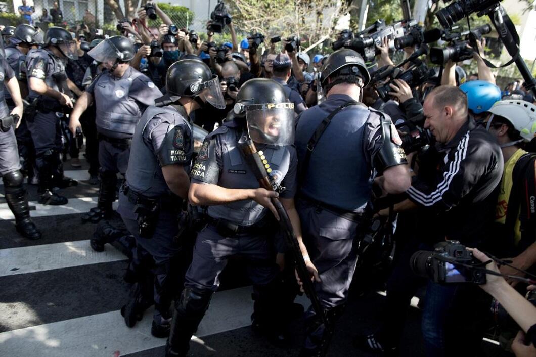1. Полиция отгоняет демонстрантов и журналистов в Сан-Паулу, (Бразилия) в четверг 12 июня 2014. (© AP Photo)