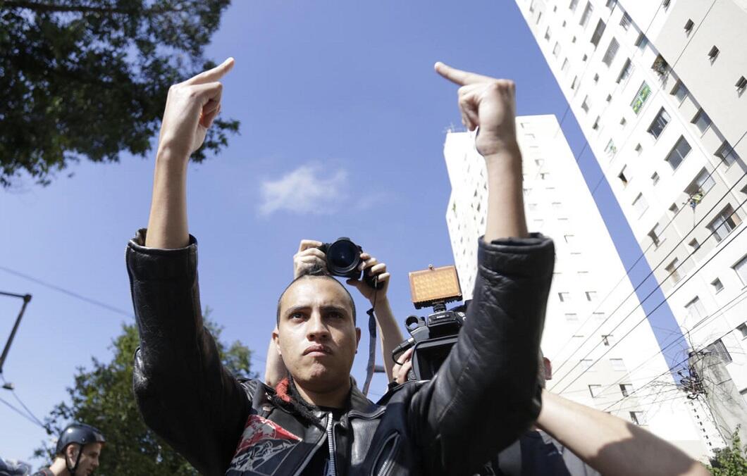 14. Демонстрант показывает жесты в сторону полицейских во время протестов в Сан-Паулу, 12 июня 2014. (© REUTERS)