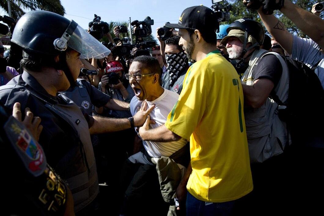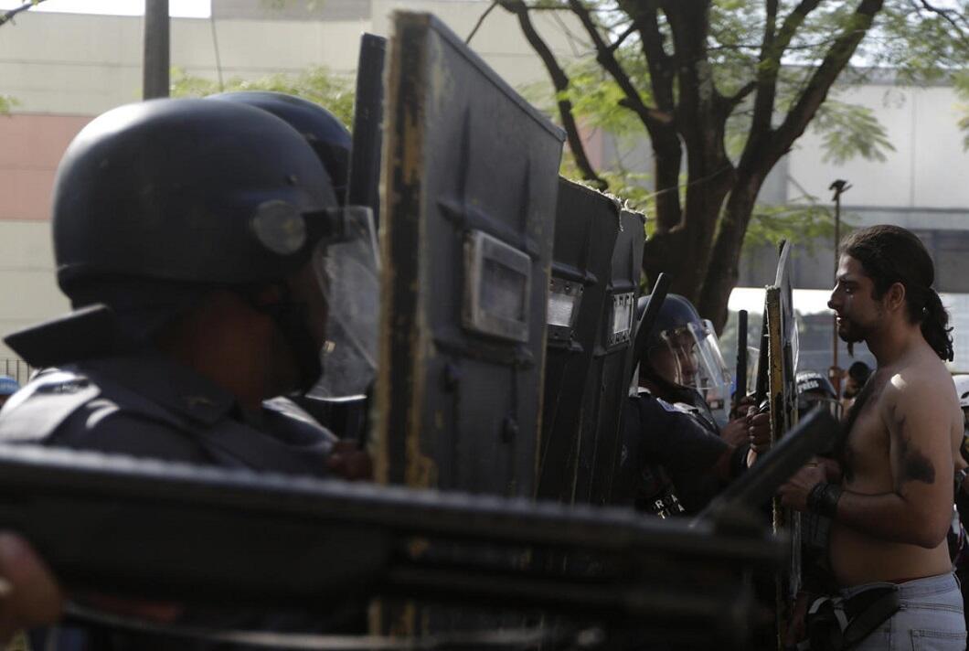 16 Демонстрант спорит с полицейскими во время протестов против ЧМ по футболу в Сан-Паулу, 12 июня 2014. (© AP Photo)