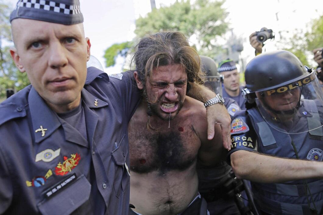 15. Полиция задерживает демонстранта в Сан-Паулу в четверг, 12 июня 2014. (© AP Photo / Нельсон Антуан)