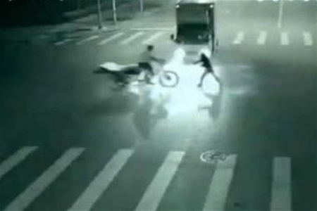 На видео отчетливо видно, как к переезжающему дорогу велосипеду стремительно приближается грузовик. Казалось бы, столкновение неизбежно, однако неожиданно велосипед вместе с велосипедистом чудесным образом исчезают и появляются на другой стороне улицы.