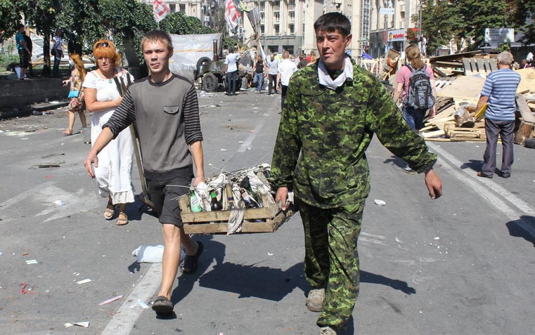 Несмотря на дождь, жители столицы продолжают убирать центр столицы – остатки баррикад и палаток вывозят грузовики.
