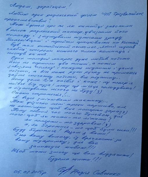 Он также обнародовал письмо Савченко, подписанное 5 марта. В нем она обращается к украинцам и сообщает, что будет менять свою тактику.