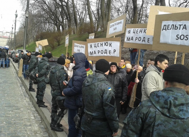 Люди держали в руках плакаты с надписями "Яценюк - мародер" и "Дельта банк SOS".