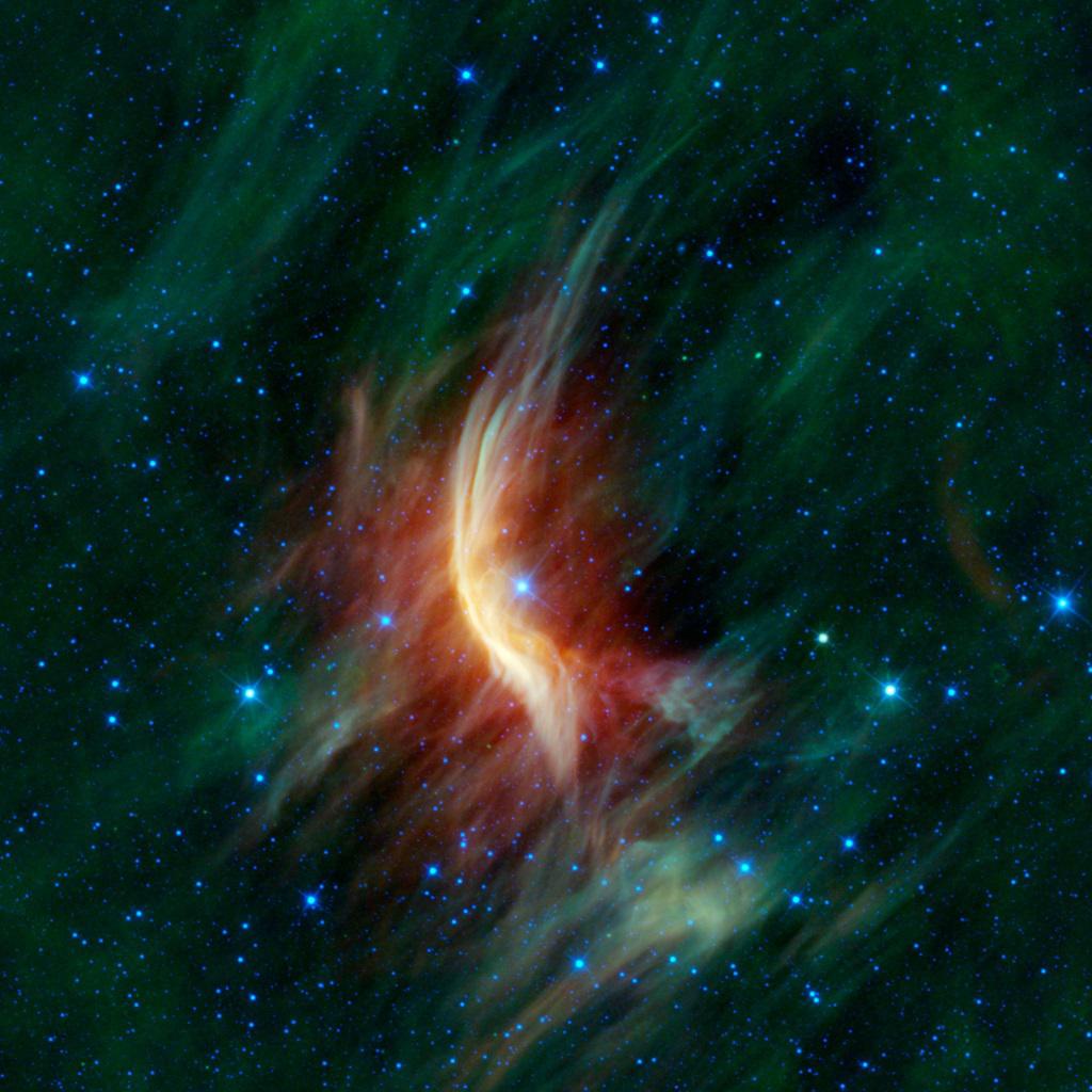Снимок этой звезды был сделан в инфракрасном диапазоне: в центре находится его главная героиня — Зета Змееносца, а вокруг заметна зеленоватая межзвездная пыль, которая краснеет, сжимаясь и нагреваясь от воздействия звезды.