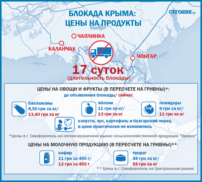 Так, если перед началом блокады баклажаны стоили в среднем 27 рублей (8,50 грн) за килограмм, то через несколько дней они уже стоили 60 рублей (19,20 грн)!