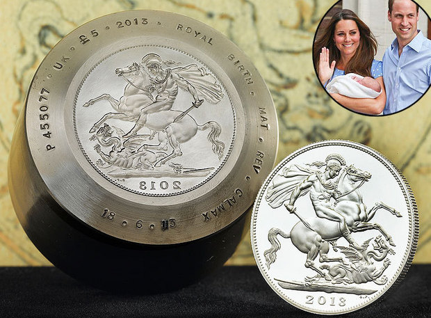 До этого монетный двор уже выпустил 5-фунтовые серебряные монеты в честь этого события, которые получили значительный успех. На их реверсе был изображен Святой Георгий, который сражает змия, так как сына герцога и герцогини Кембриджских, который может когда-то стать монархом Объединенного Королевства, назвали Георг (Джордж) Александр Луи. На 20-фунтовых монетах это изображение будет повторено.