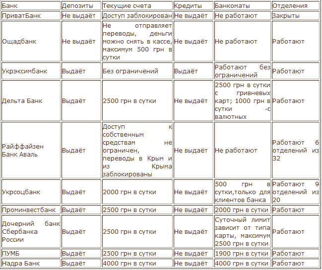 Банки, работающие в Крыму, практически полностью прекратили выдавать деньги своим клиентам после проведения референдума 16 марта 2014 года. Первое время некоторые филиалы выдавали хотя бы по 500 гривен (1 500 рублей) в день. А теперь чтобы получить даже эту сумму, нужно выехать за пределы Крыма – в одну из соседних Украинских областей.