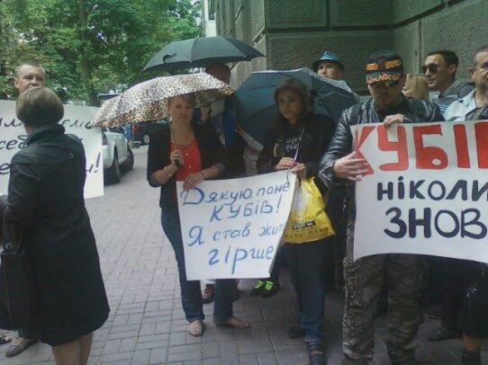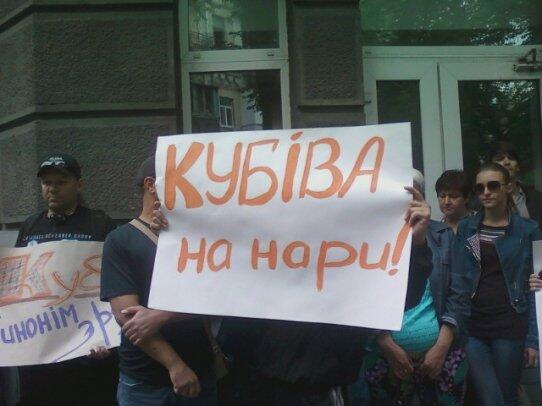 Люди держат в руках плакаты: «Требуем всесторонней проверки», «Спасибо, господин Кубив! Я стал жить хуже», «Кубива на нары», «Кубив, от люстрации не убежишь», «Кубив – услышь голос Майдана», «Не умеешь, не берись», «Доллар – 12? Спасибо, Степан».