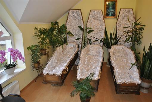 Посетители салона могут выбрать гроб среди множества различных моделей. К качеству своего товара владелец подходит чрезвычайно придирчиво: все гробы украшены кружевом и имеют шелковые подушки.