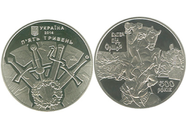 Национальный банк Украины выпустил в обращение памятную монету, посвященную 500-летию разгрома войск московского князя армией Великого княжества Литовского под Оршей (территория современной Беларуси).