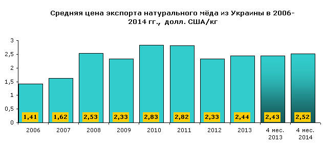 Экспорт выгоден украинским производителям вследствие привлекательности «внешних» цен. По итогам 2013 года Украина стала седьмым по важности мировым экспортером меда после Китая, Аргентины, Мексики, Вьетнама, Индии и Канады, а ее доля в мировом экспорте этого продукта составила 7-8%.
