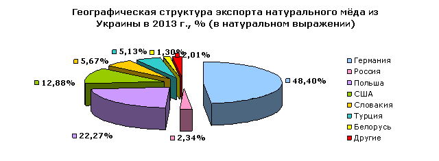 Экспорт украинского меда на 75% ориентирован на страны ЕС, однако он уже достаточно хорошо диверсифицирован и включает рынки стран Северной Америки, СНГ и Ближнего Востока.