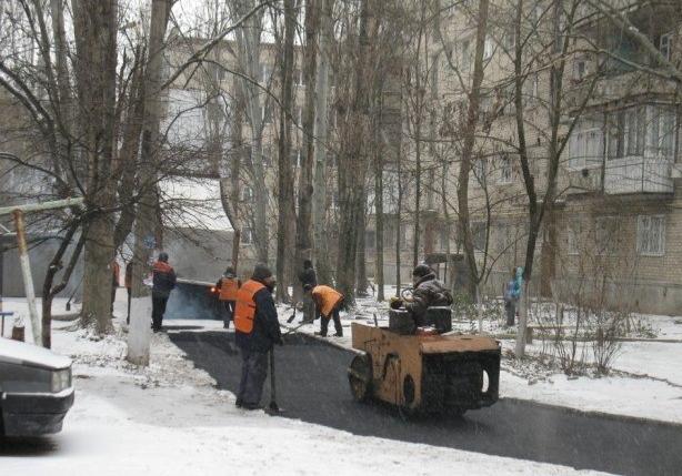 В одном из районов Николаева сотрудники дорожных служб укладывают асфальт в десятиградусный мороз и снег.