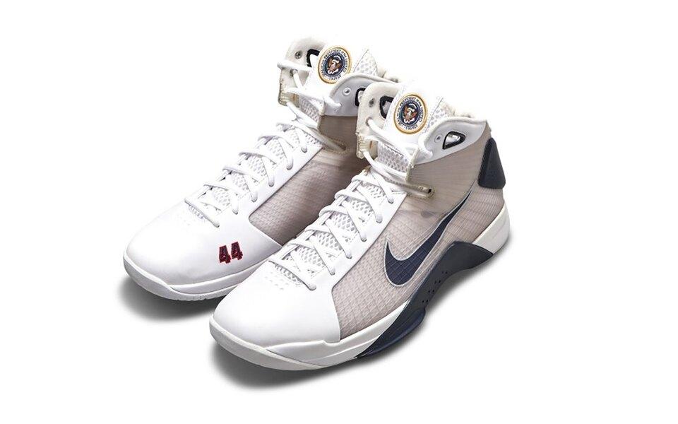Кроссовки Nike Hyperdunk PE, предназначенные для Обамы, вышли в серо-белой расцветке и украшены уникальными элементами: на носке вышиты цифры 44 (Обама был 44-м президентом США), а на язычках — президентский герб с орлом.