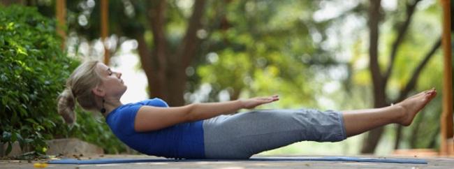 Поднимите голову и отведите ее как можно дальше назад. Ни ребра, ни тазовые кости не должны касаться пола. Только живот несет на себе вес тела. Когда полностью вытянете ноги вверх, соедините бедра, колени и лодыжки. Оставайся в таком положении 30 секунд.