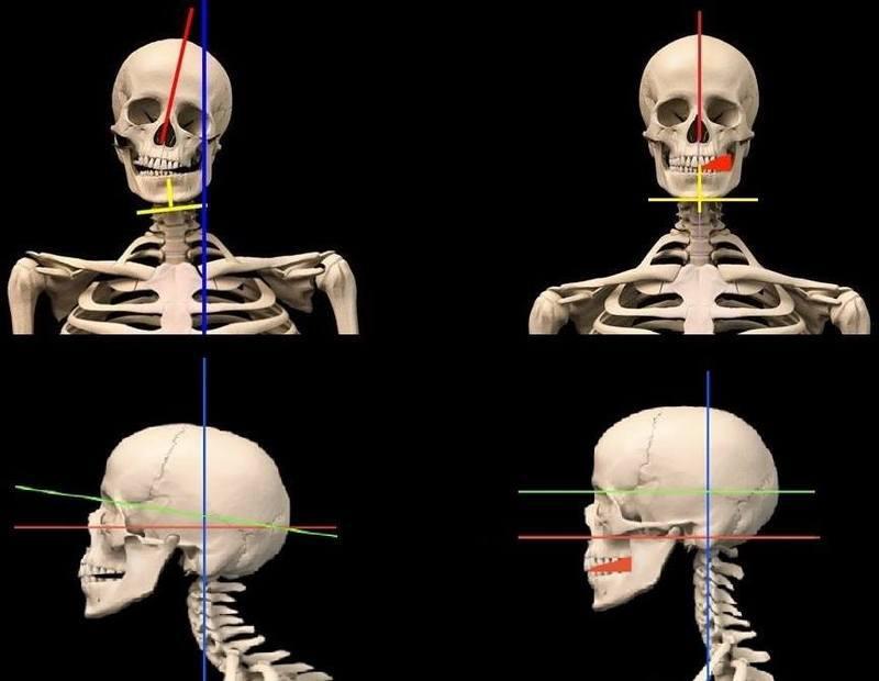 Череп опирается на зубной ряд спереди и на атлант, первый шейный позвонок сзади. Из этого следует, что зубной ряд, не обладающий достаточной высотой, перегружается в момент сжатия челюстей, черепу не на что опереться и он «проседает». Возвратить наше тело в правильное положение можно только через преобразования со стороны зубов.