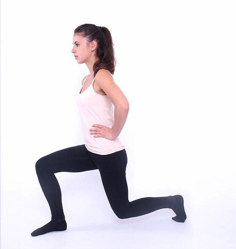 Нога, которая остается позади, должна быть прямой, а та, что впереди — согнутой. В этом положении сгибай обе ноги в коленях, опуская тело вниз; колено передней ноги должно оставаться на уровне пальцев ноги.