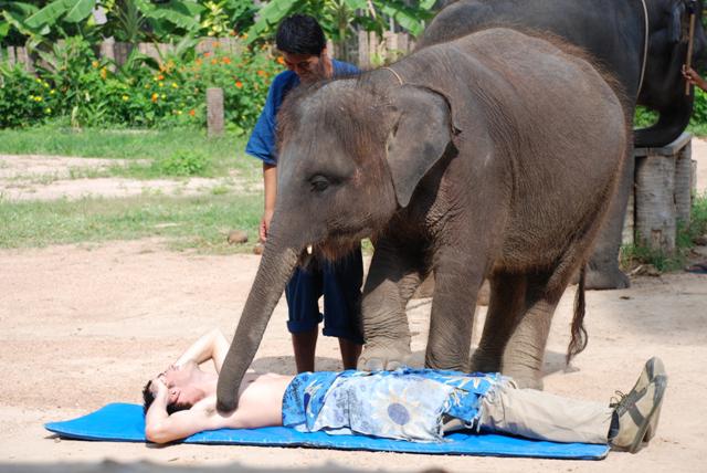 Перед тем как делать массаж,слон очень долго готовился и тренировался. Опытный тренер очень долго занимался со слоном,и пройдя экзамен,слон может делать массаж ногами и хоботом любому желающему.
