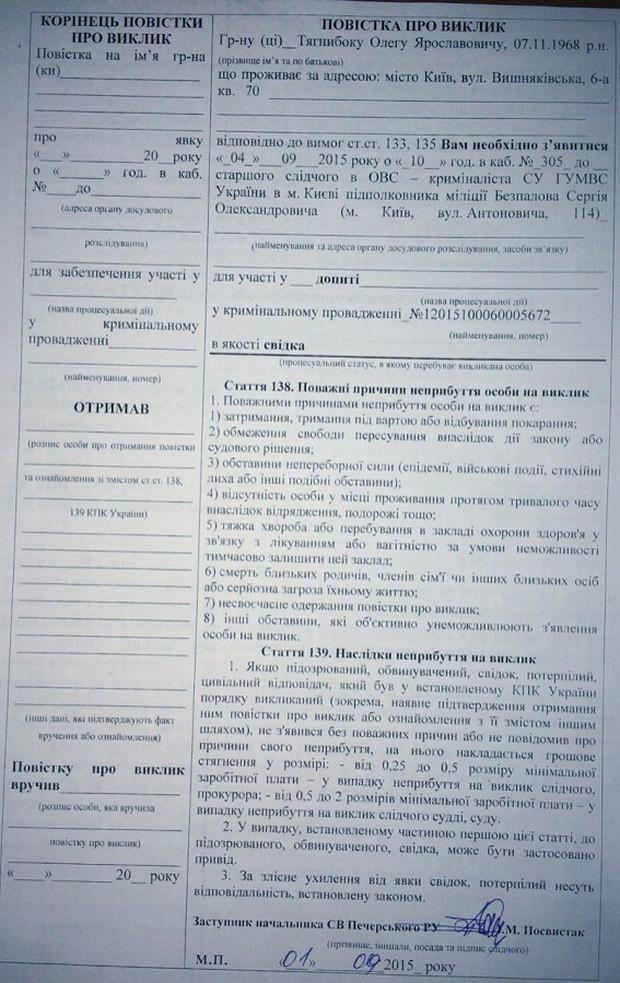 Но теперь в милиции решили пролить свет на это дело, и опубликовали копии повесток, которые были отправлены таким политикам, как Олег Тягнибок, Игорь Швайка, Игорь Криворучко, Игорь Сабий, Эдуард Леонов, Владимир Назаренко, и Юрий Сиротюк.