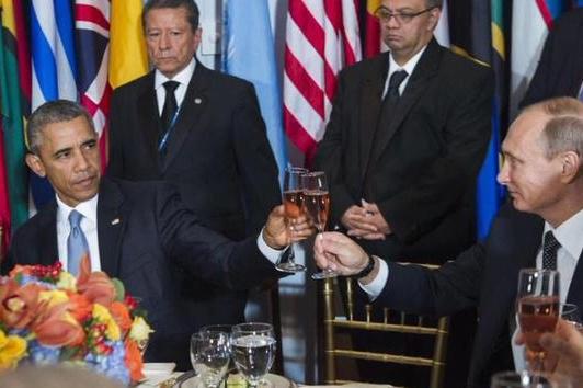 На одной из фотографий с официального завтрака в честь 70-летия ООН Путин и Обама сидят с поднятыми бокалами, но без Пан Ги Муна. Тогда как на видео Генсек всегда был между президентами. Значит ли это, что он намеренно ушел, чтобы политики могли поговорить вдвоем? Такой вопрос задали журналисты российскому лидеру.