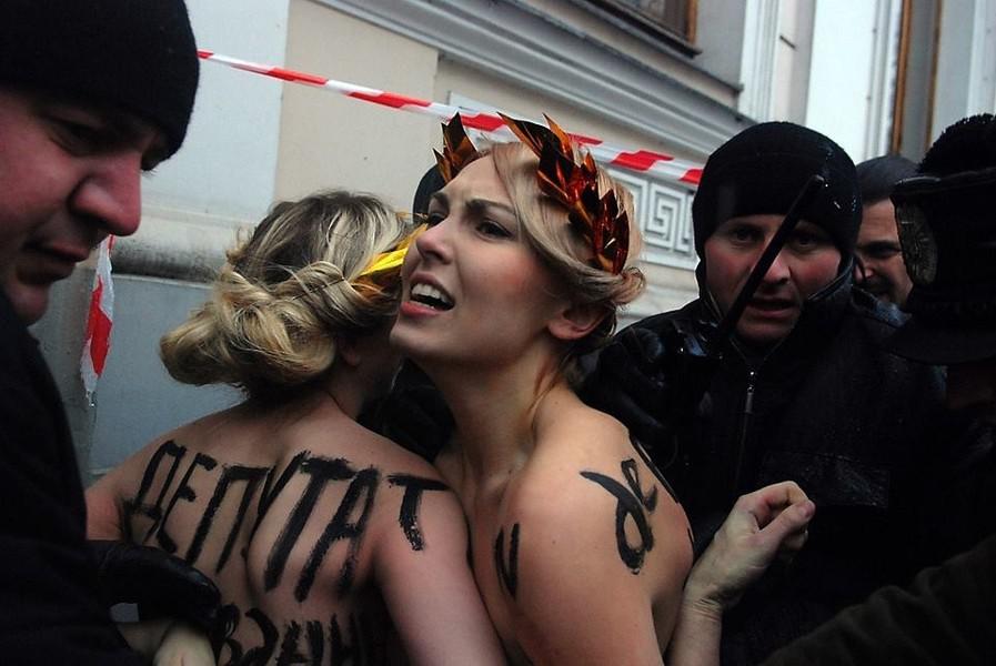 Как уточняется, активистки были обнаженными, при задержании правоохранители укрыли их куртками.