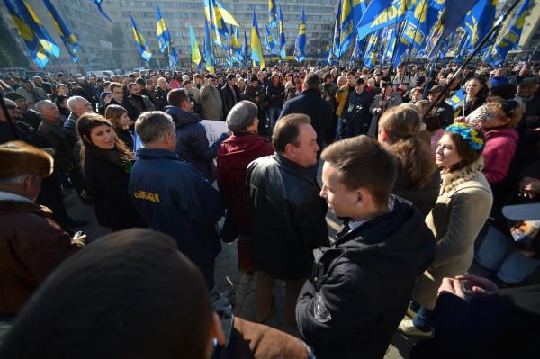 Как сообщает Андрей Ильенко, депутат «Свободы», за прошедшие два года нынешнее правительство полностью ограбило государство, не проведя ни одной существенной реформы и отметил, что Байдену следует посмотреть на то, как украинцы относятся к правительству Яценюка. На митинге сейчас присутствует порядка 300 человек, некоторые держат плакаты с фотографией премьера, у которого на лбу нарисована красная точка с подписью «Пуля в лоб».