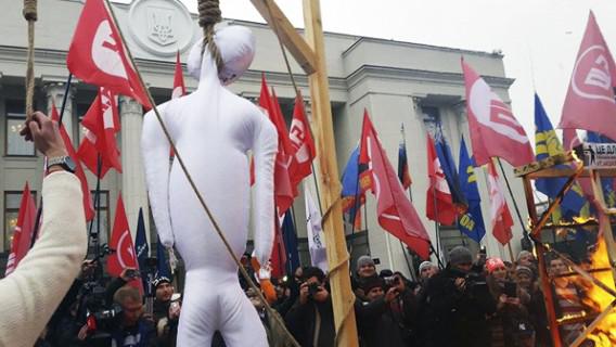 "Только что активисты, которые пикетируют на площади Конституции возле Верховной рады, принесли на свой пикет импровизированную виселицу, и она должна символизировать то, что народные депутаты не прислушиваются к голосу народа Украины, то соответственно их ждет виселица"