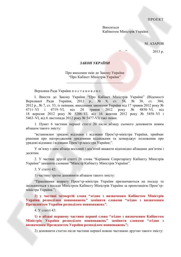В Парламент внесен законопроект "О внесении изменений в закон "О Кабинете министров Украины". Документ оставляет Николаю Азарову роль ритуального премьера и передает полномочия правительства Президенту.