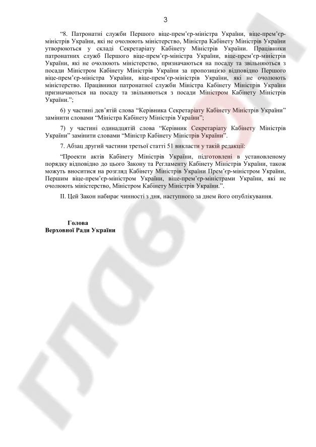 Законопроект был зарегистрирован в парламенте сразу после Рождества. Авторы документа предлагают "отдать" президенту право распределять полномочия первого вице-премьера и вице-премьеров (согласно действующей редакции это осуществляет Кабмин). Первому вице-премьеру и вице-премьерам к тому же будет разрешено иметь патронатные службы.