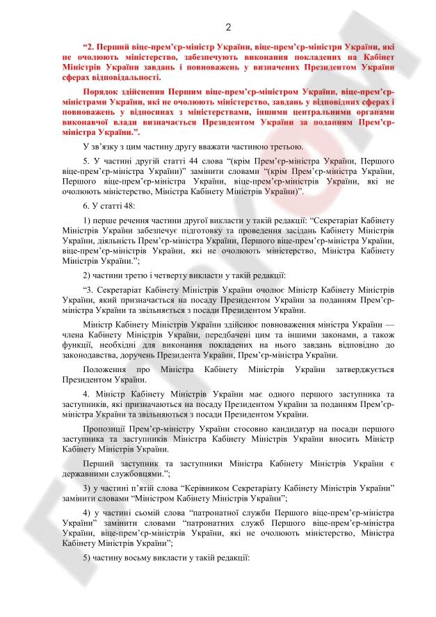Также, согласно законопроекту, президент фактически полностью переподчиняет себе Кабмин и Секретариат правительства. То есть президент считает необходимым подчинить себе человека, который держит под контролем документы, которые входят и выходят из здания на Грушевского, отвечает за план работы Кабмина и проект повестки дня.