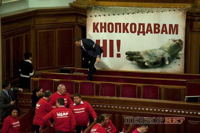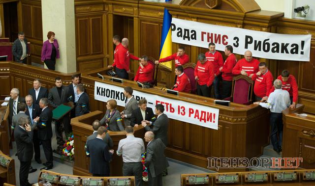 По всему залу Верховной Рады развешены плакаты со следующим текстом: "Рада гниє з Рибака", "Кнопкодавам - ні!".