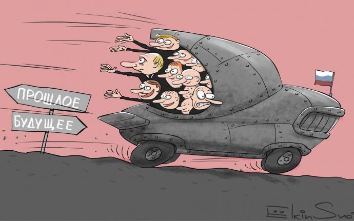 Карикатурист Сергей Елкин решил создать очередной шедевр по этому поводу. Он сделал карикатуру, на которой российские политики сидят в машине, которая несется в направлении «будущее».