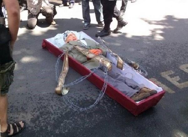 При этом участников мероприятия сопровождал оркестр, который играл траурную и весёлую музыку. По словам одного из представителей "Правого сектора" Юрия Лихоты, таким образом его единомышленники отправили поздравительное послание правительству России.