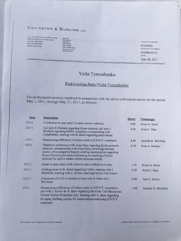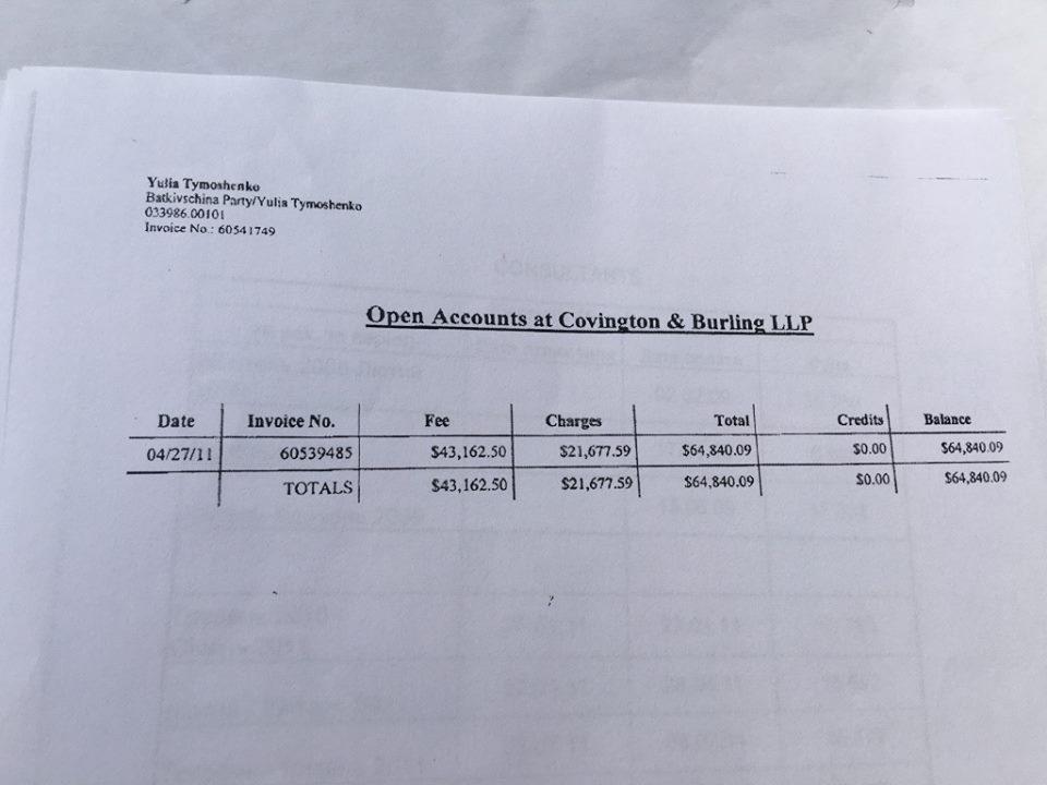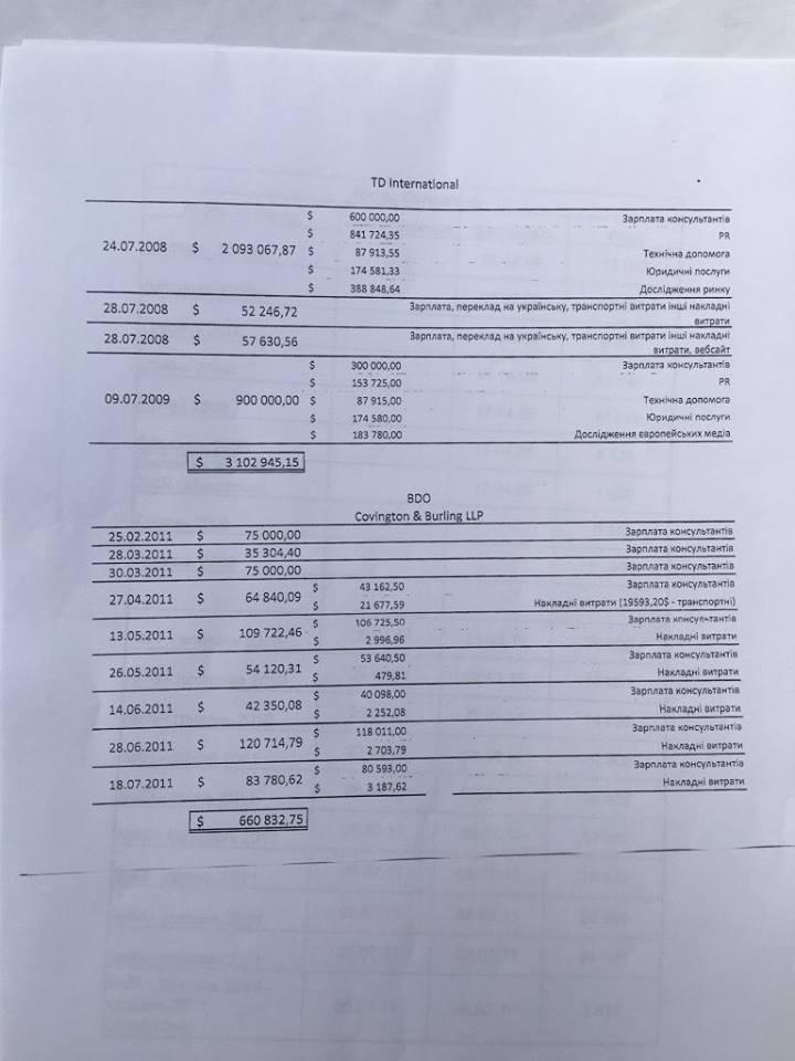 Суммы баснословные – $900 тысяч, 2,01 млн... В платежках указана довольно известная американская фирма Covington & Burling. Документы охватывают период с 2008 по 2011 годы». Он также отметил, что готовит информационные запросы в данную компанию и партию «Батькивщина».