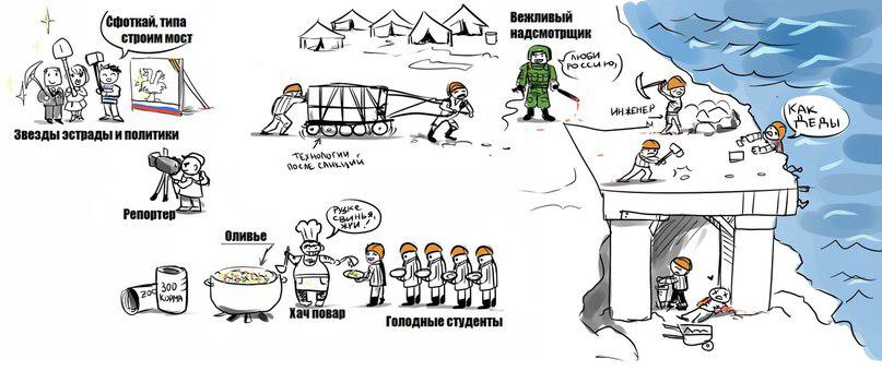 По данным им будут платить от 150 рублей за час работы. Эту идею стал активно тролить Интернет, в соцсетях появилось множество фотожаб о Путине, который придумал использовать студентов в постройке моста.