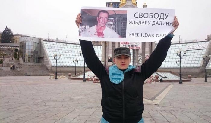 На Майдане Независимости в центре украинской столицы Надежда сфотографировалась с плакатом, на котором было написано «Свободу Ильдару Дадину». Оппозиционер сейчас сидит в российской тюрьме, а в свое время также добивался ее освобождения.