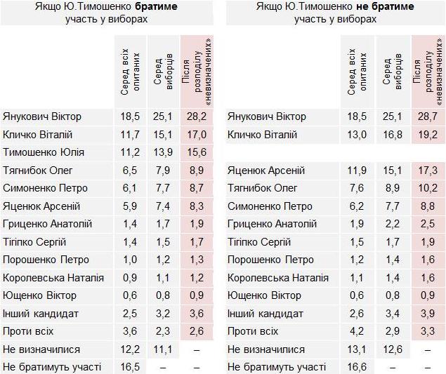 В случае если Ю.Тимошенко не будет участвовать в выборах, тройка лидеров выглядит следующим образом: В.Януковича поддержали бы 25,1% опрошенных, 16,8% - В.Кличко, 15,1% - А.Яценюка. Кроме того, 8,9% поддержали бы О.Тягнибока, 7,7% - Симоненко, 2,2% - А.Гриценко, 1,7% - С.Тигипко, 1,4% - П.Порошенко, 1 , 4% - Н.Королевская, остальные политиков - более 4%, не определились - 12,6%, «против всех» - 2,3%.