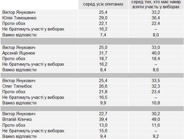 В частности, Януковича поддержали бы 25,1% опрошенных (среди тех, кто принял бы участие в выборах), 15,1% - В.Кличко, 13,9% - Ю.Тимошенко, 7,9% - О.Тягнибока , 7,7% - Симоненко, 7,4% - А.Яценюка. Остальные политиков поддерживают значительно меньше: 1,7% - А.Гриценко, 1,5% - С.Тигипко, 1,2% - П.Порошенко, 1,1% - Н.Королевская, остальные политиков - 4%, не определились - 11,1%, «против всех» - 2,3%.