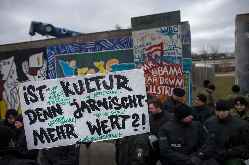 В Берлине проходит акция протеста против сноса части Берлинской стены, оставшейся известной как "Галерея Восточной стороны".