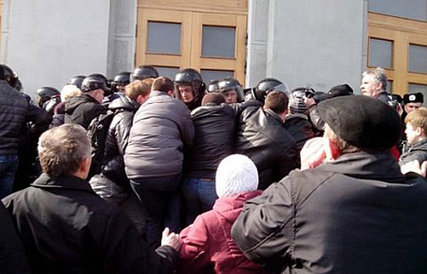 Они попытались прорваться внутрь, но их не пустили около 30 милиционеров в шлемах и бронежилетах.