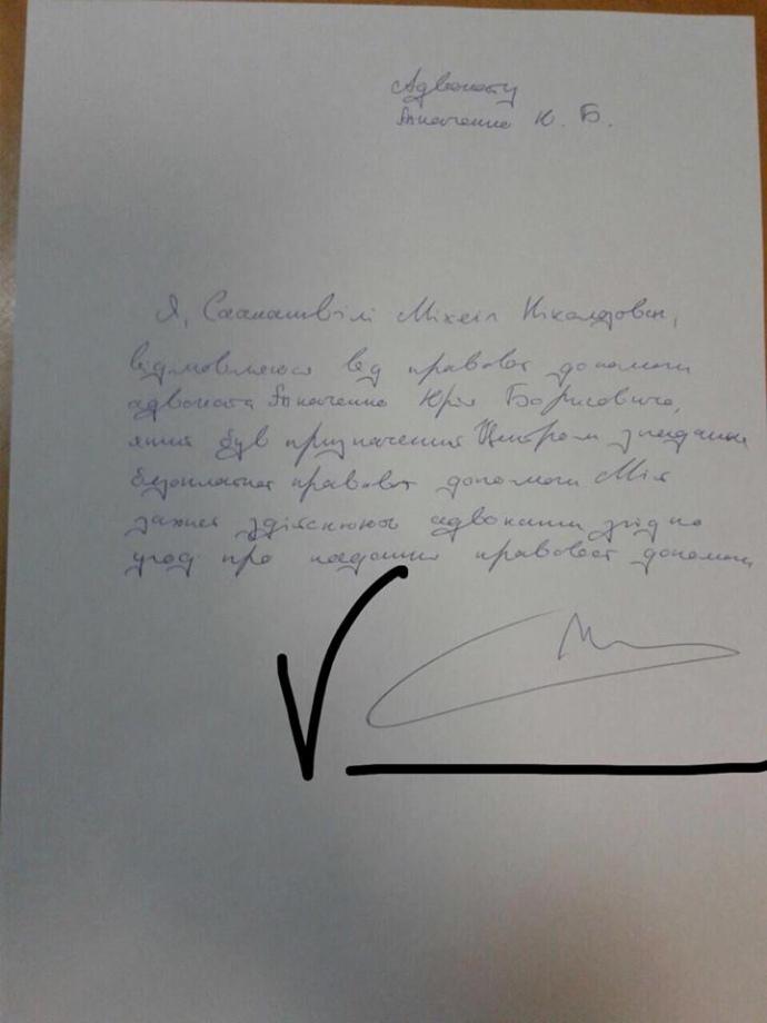 "Второй документ (заявление об отказе от адвоката, предоставленного Центром бесплатной правовой помощи) был написан моей коллегой, которая помогала оформлять документы, и текст заявления был написан ею, а подписан Саакашвили - в присутствии двух прокуроров и трех представителей ИТТ, в т.ч. начальника", - пояснил Чернолуцкий.