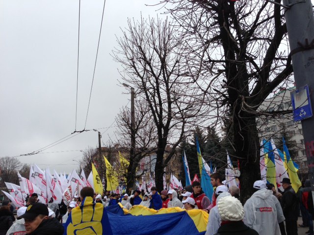В начале колонны активисты развернули огромный национальный флаг. Люди держат национальные и партийные флаги, плакаты «Украина волю Юле Волю», «Свободу Юле!» « За достойную пенсию», «За справедливую зарплату»,«Банду геть!». Участники митинга скандируют «Юле волю!»