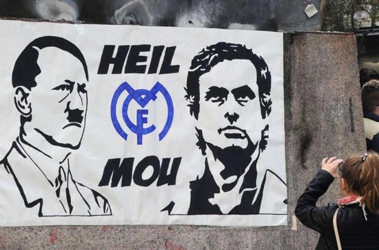 В испанском чемпионате вот-вот разразится нацистский скандал. На мадридском "Сантьягу Бернабеу" на игре "Реала" и "Леванте" (5:1) был вывешен возмутительный плакат, на котором в карикатурном стиле изображены тренер "Королевского клуба" Жозе Моуринью и Адольф Гитлер. Между ними эмблема клуба и фраза "Хайль Моу".