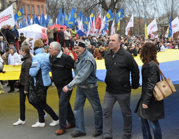 Акция «Вставай, Украина!» стартовала около 12:30. Колонна людей прошла от памятника Тарасу Шевченко к Театральной площади города.
