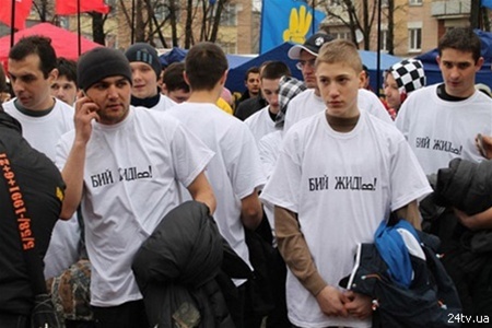 Напомним, 6 апреля во время оппозиционного митинга в Черкассах около 40 молодых людей в футболках с надписью "Бей жидов!" и "ВО Свобода" пытались сорвать проведение оппозиционной акции.