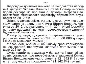 Согласно декларации, общая сумма совокупного дохода народного депутата Кличко Виталия Владимировича за 2012 год составила — 11 204 гривны. Размер доходов, полученных (начисленных) из источников за пределами Украины: из ФРГ — 5000000 долларов США (40 миллионов гривен).