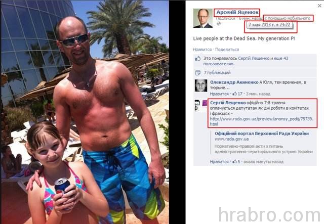 Лидер «Батькивщины» Арсений Яценюк был замечен отдыхающим на Мертвом море в Израиле. Остановился вождь Объединенной оппозиции в фешенебельном пятизвездочном отеле «Royal Rimonim Dead Sea».