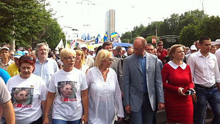 Затем, когда к театру подъехали народные депутаты Украины, лидеры «Батькивщины» и ВО «Свобода» Арсений Яценюк и Олег Тягнибок, сформировалась колонна, и около 3 тысяч участников акции, перекрывая одну из полос двухстороннего движения по центральной улице Донецка, направились к памятнику Шевченко.